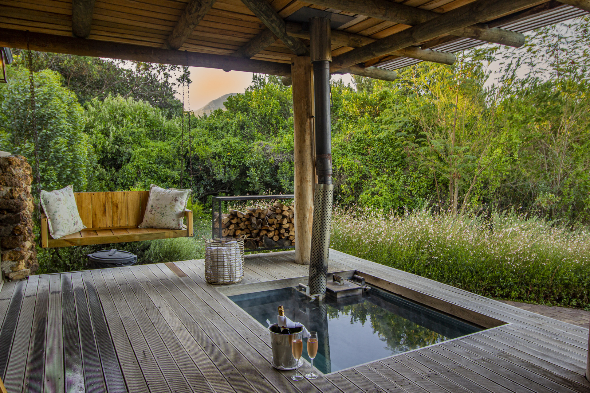 Communal outdoor fireplace & stoep, with a wood-fired hot tub