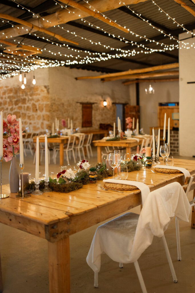 Nestled amidst the serene landscapes of the Uilkenkraal Valley near Gansbaai, all of us here at De Uijlenes witnessed an extraordinary celebration of love as Mienke and Wessel embarked on their journey together in a magical winter wedding in July. The Forest and Old Bar venue at De Uijlenes served as the beautiful backdrop for this three-day celebration, radiating warmth and joy despite the chilly weather.