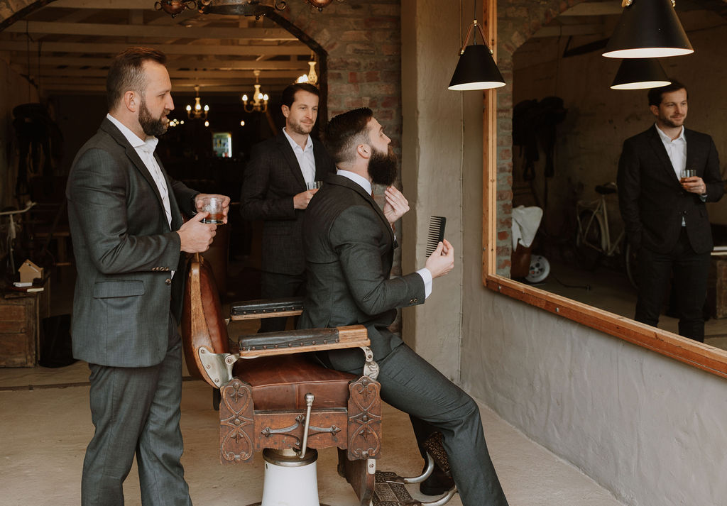 Meanwhile, Wessel, was in for a treat at our vintage-style grooms’ barber station in the cigar lounge. With a classic barber chair and a touch of nostalgia, he styled his beard, gearing up for the big day ahead with his groomsmen.