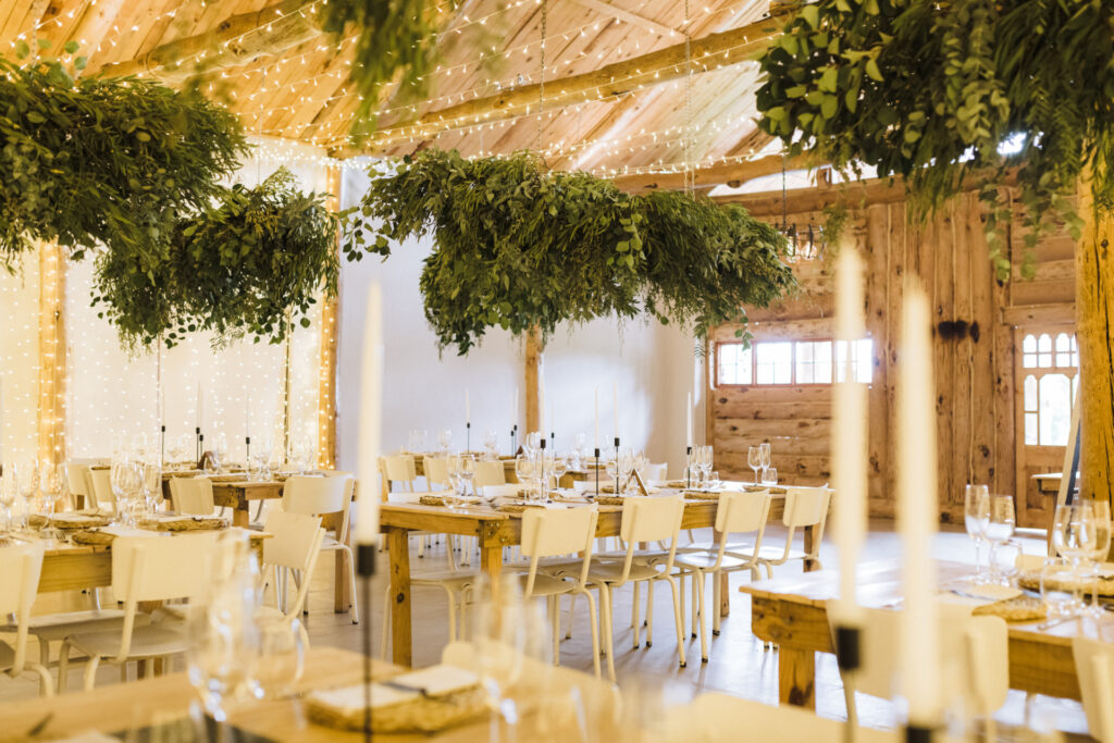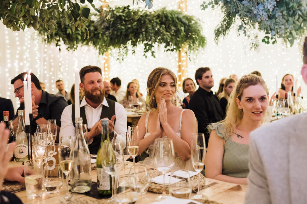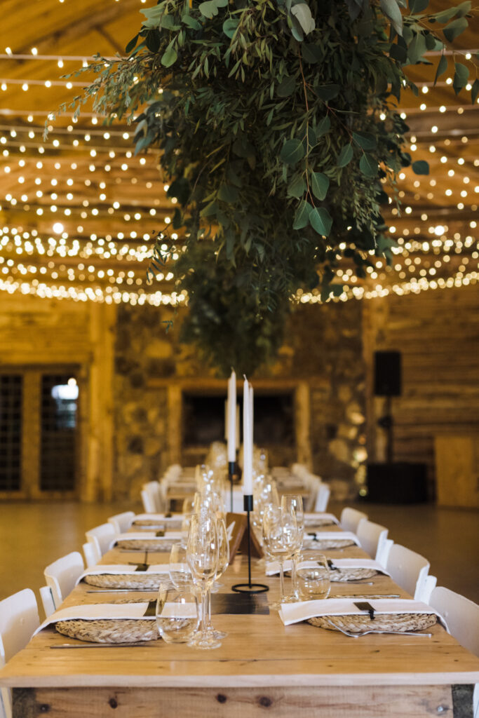 Now, imagine stepping into this cozy log cabin, where love was definitely in the air. The wooden walls gave it that warm and fuzzy feeling, like being wrapped in a giant hug. And you know what’s the best part? Kerryn and Ryan decked it out with greenery hanging above the tables, flickering candles, and twinkling fairy lights. The whole place screamed “love is in the cabin!” Their attention to detail made it clear that this wedding was all about celebrating their love story in style.