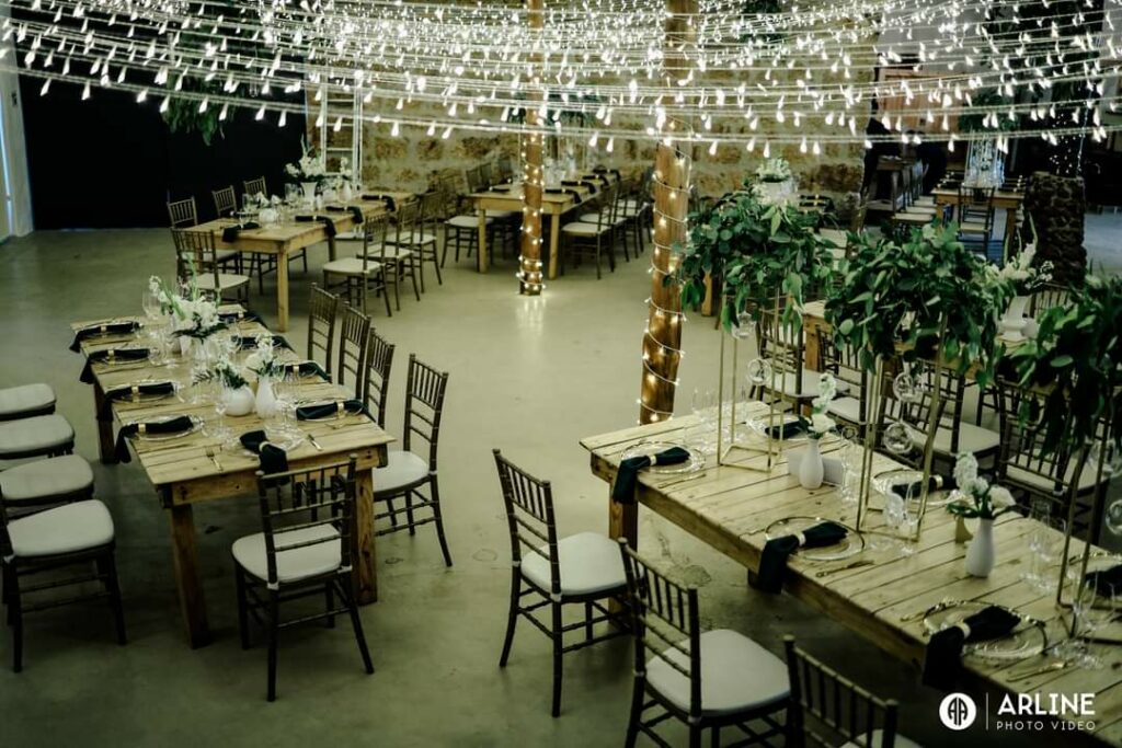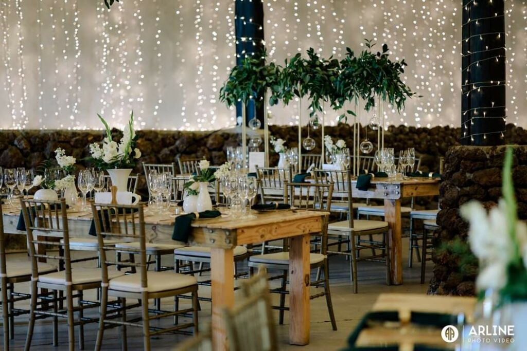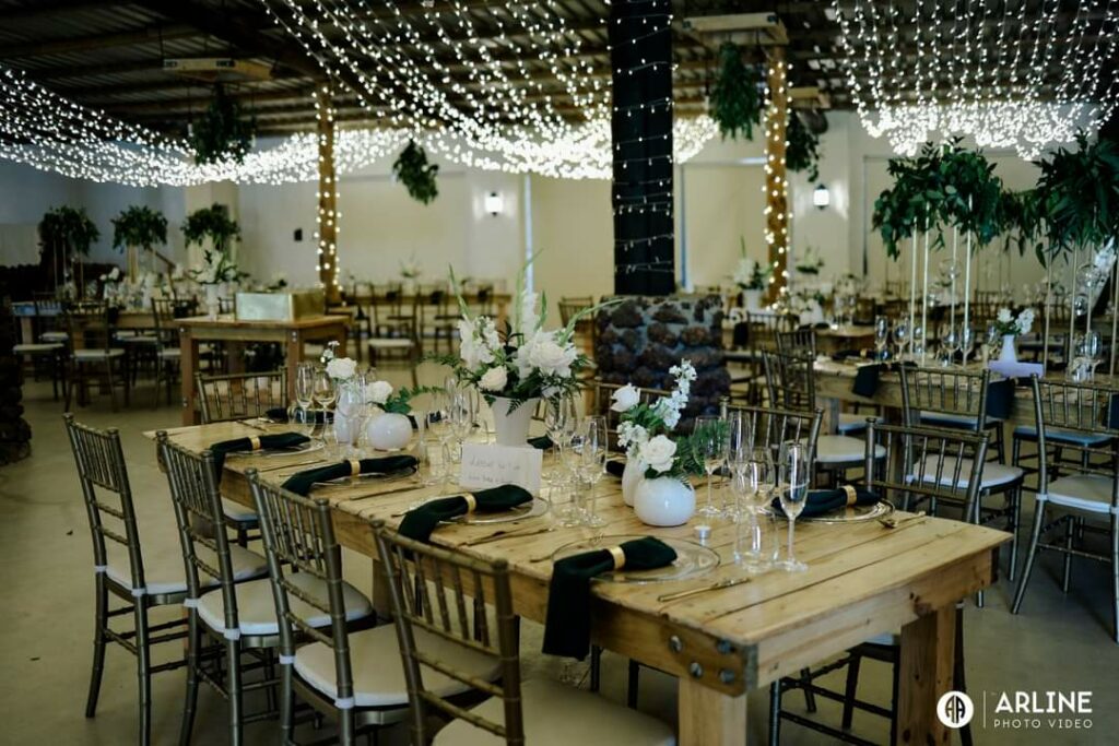 Randall and Jade said their wedding nuptials under the large majestic oaks in the Forest here at De Uijlenes.  Then, after the pre drinks, they moved the celebrations to the Old Barn venue which was decorated with golds, greens and black with tiffany chairs along with our rustic wooden tables.  Here’s what Jade had to say about their experience here at De Uijlenes: